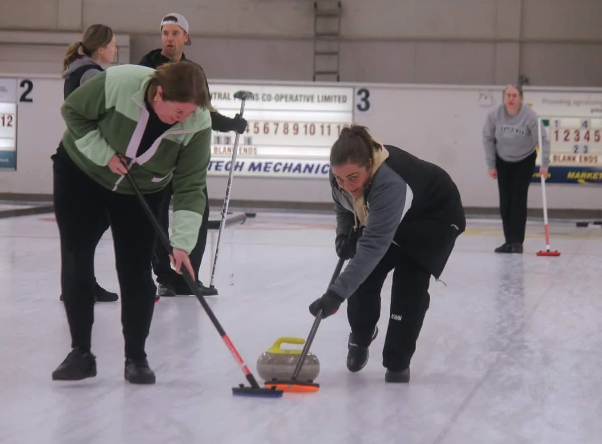 Skip Roxan Foursha looks at the rings as she and second Jolene Bourgoyne brush a rock thrown by third Jasmine Green. They were playing Ashley and Tyler Ritchie, Amber Petrushka and Tawnya Serfas in the Sheet 4 final of the Ice-Breaker Spiel here on Jan. 10. The Ritchie team won 8-4. Photo by David McIver