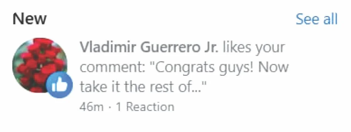 Springer had been hit in the knee the night before, so there was some doubt he’d even play. My sister shared a post on the Blue Jays Facebook page: “Congrats guys! Now take it the rest of the way! My mom was a huge fan and she passed last December at 88. She’s smiling down on you, and the fact that George hit the winning home run was an extra bonus for her ….George was my dad’s name.” And then Vladimir Guerrero Jr. LIKED HER COMMENT. I repeat: Vlad Jr. liked HER comment, not mine — the one actually writing about baseball. Where is the justice?
