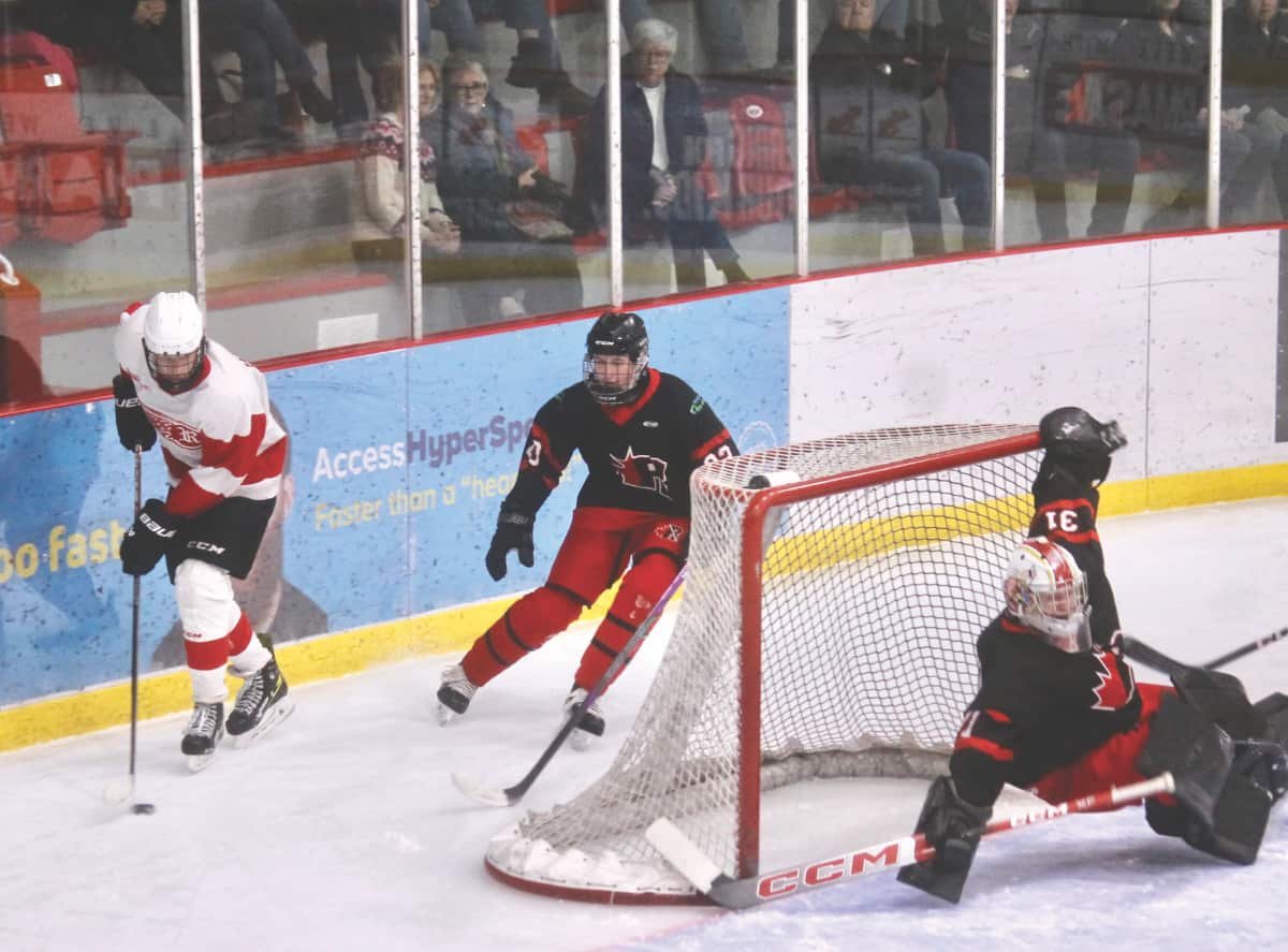 Deklan Hawken of the under-18 Redwings brings the puck around the net, followed by Landen Casavant of the Tisdale Ramblers. Goalie Graham Whiting tries to get back on his skates during this first-period action here on Feb. 14. The Redwings defeated the Ramblers 7-2, and having tied 4-4 in Tisdale on Feb. 13, advanced to the second round of U-18 C provincial playoffs vs. the Unity Lazers with games in Unity last Saturday and here this Saturday.