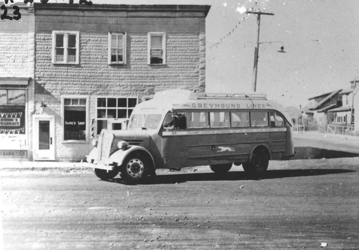 An early version of a Greyhound bus during the maiden voyage of the Greyhound Bus Lines’ Saskatoon to Calgary route, circa 1937. This picture looks west on Main St. and 2nd Ave. A Barber Shop and Hudson’s Pharmacy can be seen in the background.