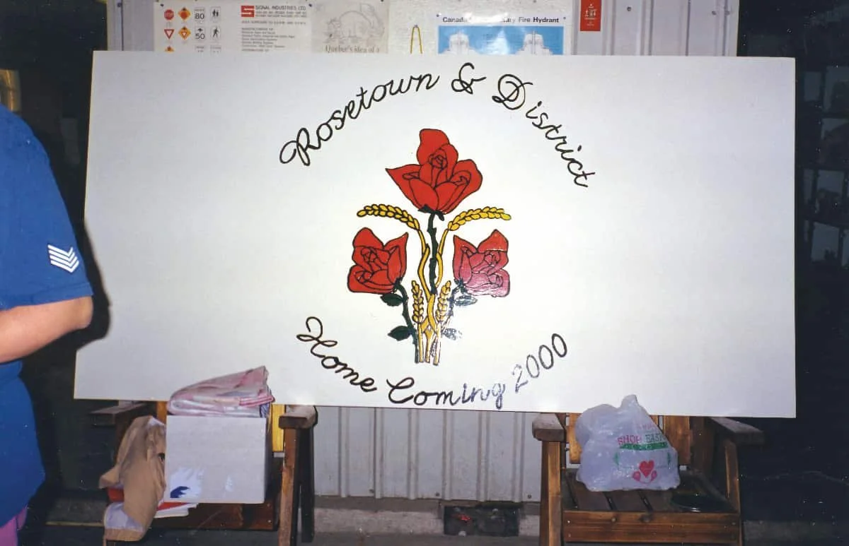 In July of 2000, Rosetown held a huge Homecoming celebration. There were sidewalk sales, a parade with live bands, pancake breakfast, dances, fireworks, plays, and our wonderful museum had its grand opening. It was a massive community effort to organize an event of this size and have it turn out to be such a success. Pictured here is a promotional sign hand painted and designed by members of the Homecoming committee.