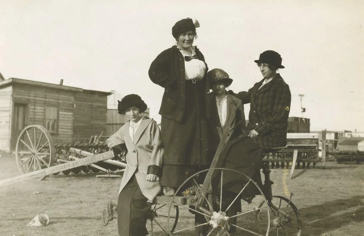 Four women perched on a John Deere sulky plow in the 1910s. This photo is believed to have been taken behind C.E. Conlin’s shop on the 100 block of Main Street in Rosetown. Gertrude Kunkel (nee Buchanan) on the far right; possibly one of her sisters on the far left. Mrs. Con Warner (Laura, nee Coulter) second from left. Laura Warner’s sister, Edith, was the wife of C.E. Conlin.