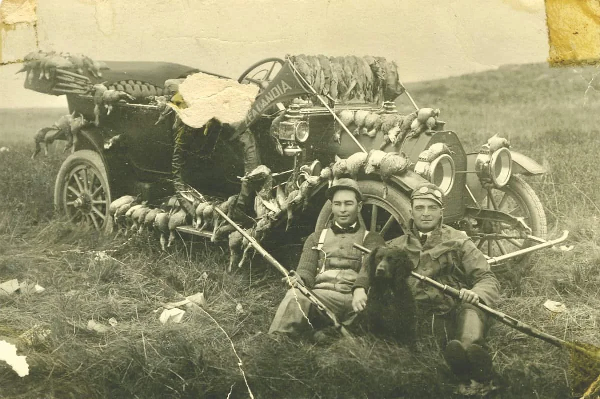 Two unknown men and a hunting dog (a very good one, by the looks of it) sit on the ground on a grassy hillside in front of an antique car covered in ducks they successfully hunted, circa 1920. A flag bearing the town name of “Zealandia” is sticking out from the front right tire of the car. What a satisfying feeling it must have been to arrive back home with a wealth of duck meat to share!